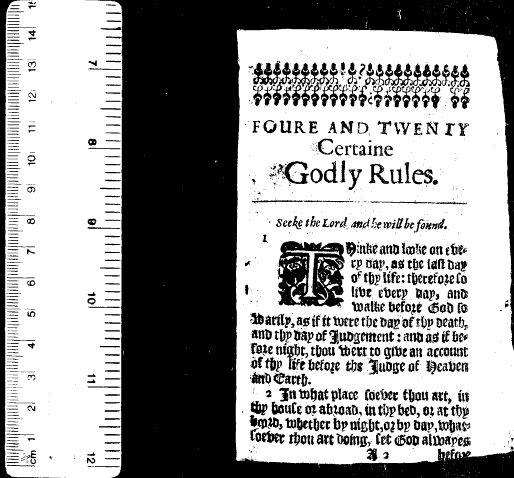 D–F, LocatedFoure and Twenty Certaine Godly Rules (ca. 1640) Foure and twenty certaine godly rules (London? : s.n., ca. 1640) Sotheby’s 1856 lot 15. ESTC S504. British Library Cup.408.d.8.(5.) . Located by Paul Morgan. Like Loading... Related