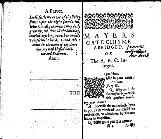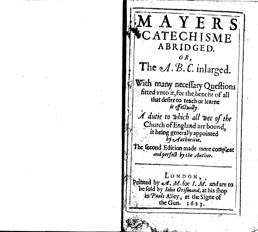 Mayer, John. Mayers catechisme abridged, or, The A.B.C. inlarged (London : Printed by A. M[athewes] for I. M[arriot] and are to be sold by Iohn Grismand, at his shop in Pauls Alley, at the signe of the Gun, 1623)