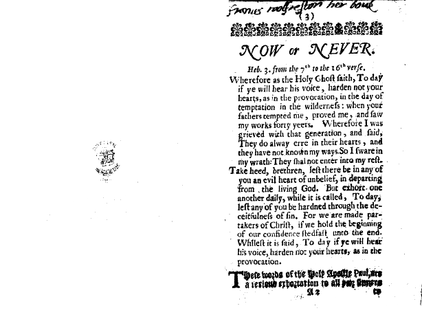 B.R. Now or never, work out your salvation with fear and trembling, or, A serious exhortation to all poor sinners to lay hold upon Christ Jesus, who is the fountain of all happiness, and who is the onely rock from whence doth spring all their comforts (London : Printed for Charls Tyus, at the three Bibles on London-bridge, 1663)