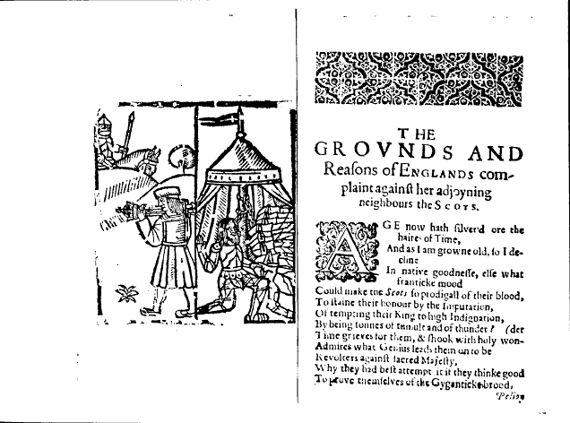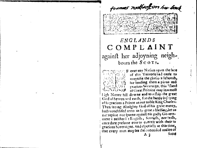 Saltonstall, Wye. England’s complaint : against her adjoyning neighbours the Scots : occasioned by the factious Covenanters, in their disloialty to his Sacred Majesty, this present yeare (London : Printed [by Thomas Harper] for Richard Harper at the Bible and Harpe, neare the Hospitall gate in Smithfield, 1640)