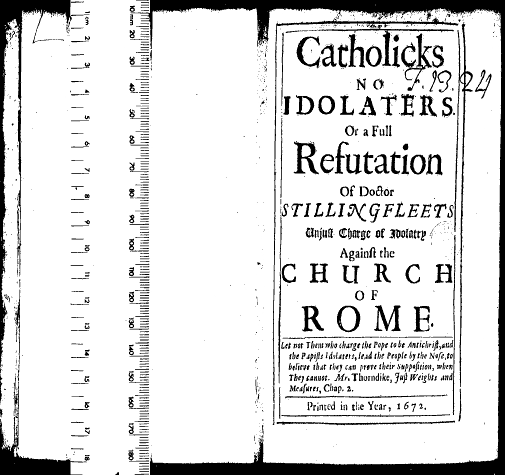 Godden, Thomas. Catholicks no idolaters, or, A full refutation of Doctor Stillingfleet’s unjust charge of idolatry against the Church of Rome (London : s.n., 1672)
