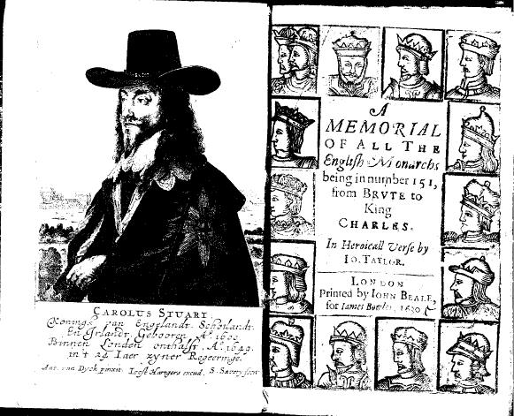 Taylor, John. A memorial of all the English monarchs being in number 151, from Brute to King Charles (London : Printed by Iohn Beale, for Iames Bowler, 1630)