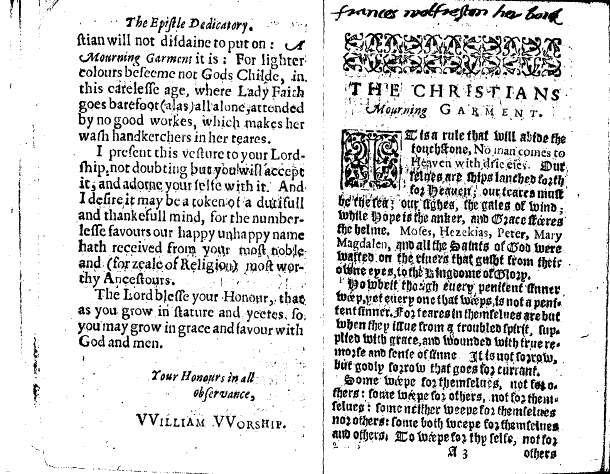 Worship, William. The cristians mourning garment (London : Printed for I. B[eale] for Robert Bird, and are to be sold at his shop at the signe of the Bible in Saint Laurence lane, 1636)