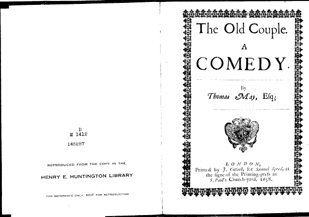 M–O, UnlocatedMay – The Old Couple : A Comedy (1658) May, Thomas. The old couple : a comedy (London : Printed by J. Cottrel, for Samuel Speed, at the signe of the Printing-press in S. Paul’s Church-yard, 1658) Sotheby’s 1856 lot 316. ESTC R9133. Unlocated. Like Loading... Related