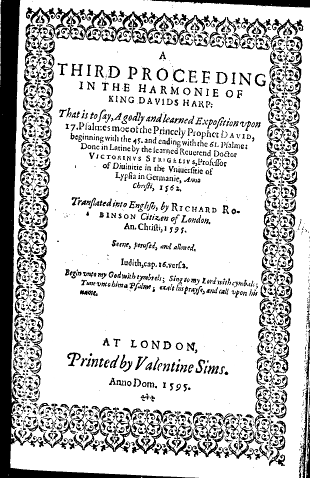 Strigel, Victorinus. A third proceeding in the harmonie of King Davids harp, that is to say, a godly and learned exposition vpon 17 Psalmes moe [sic] of the princely prophet Dauid, beginning with the 45 and ending with the 61 Psalme (London : Printed by Valentine Sims, 1595)