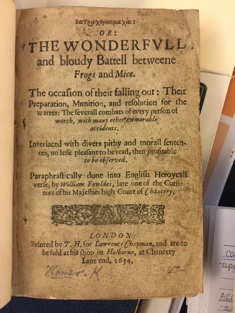 Homer (attributed). Translated by William Fowldes. Batrachomyomachia, or, The wonderfull and bloudy battell betweene frogs and mice. The occasion of their falling out : their preparation, munition, and resolution for the warres : the severall combats of every person of worth, with many other memorable accidents. Interlaced with divers pithy and morall sentences, no lesse pleasant to be read, then profitable to be observed (London : Printed by Thomas Harper, for Lawrence Chapman, and are to be sold at his shop in Holborne, at Chancery lane end, 1634)