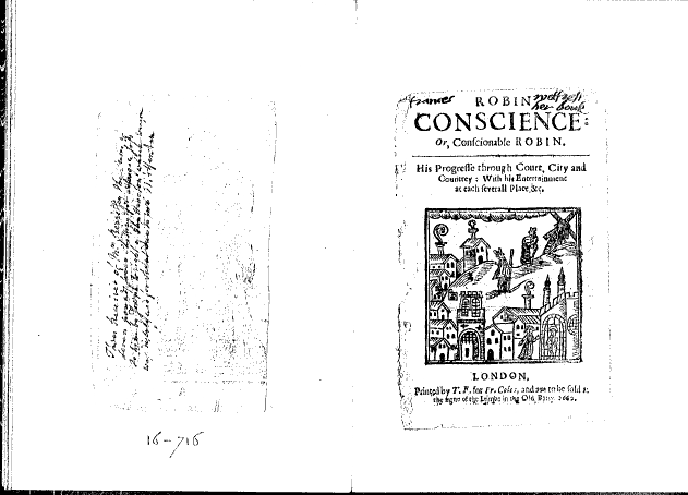 Parker, Martin. Robin Conscience, or, Conscionable Robin : his progresse through court, city and countrey: with his entertainment at each severall place, &c (London : Printed by T.F. for Fr. Coles, and are to be sold at the signe of the Lambe in the Old Baley, 1662)