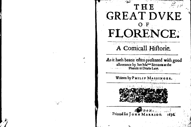 Massinger, Philip. The great Duke of Florence : a comicall historie : as it hath beene often presented with good allowance by her Maties Servants at the Phoenix in Drurie Lane (London : Printed [by Miles Flesher] for John Marriot, 1636)