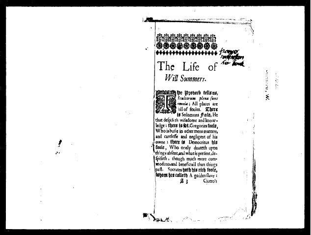 A pleasant history of the life and death of Will Summers : and how hee came first to be knowne at the court, and how he came up to London, and by what meanes hee got to be King Henry the eights iester (London : Printed by I. Okes and are to be sold by F. Grove and T. Lambart, 1637)