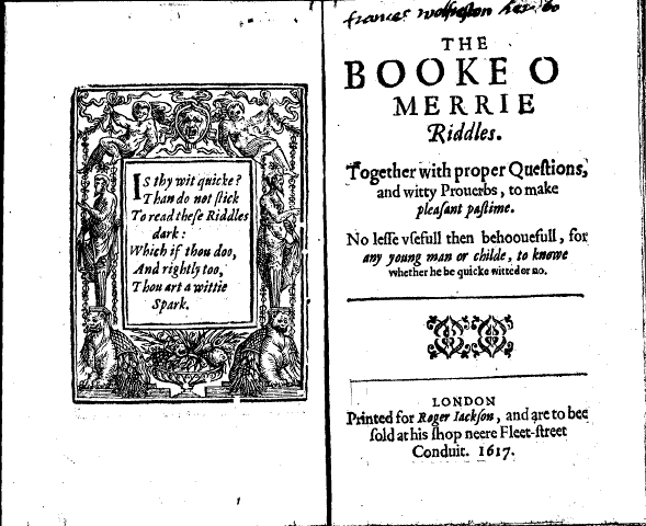 The booke o[f] merrie riddles : together with proper questions, and witty prouerbs, to make pleasant pastime : no lesse vsefull then behoouefull, for any young man or childe, to knowe whether he be quicke-witted or no (London : Printed [by J. Beale?] for Roger Iackson, and are to bee sold at his shop neere Fleet-street, 1617)